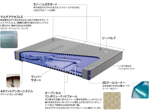 永遠不変のパスカルの原理を利用しているため、均一の支えを実現し、寝心地が変化しにくいという特性を持っています。